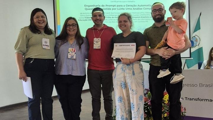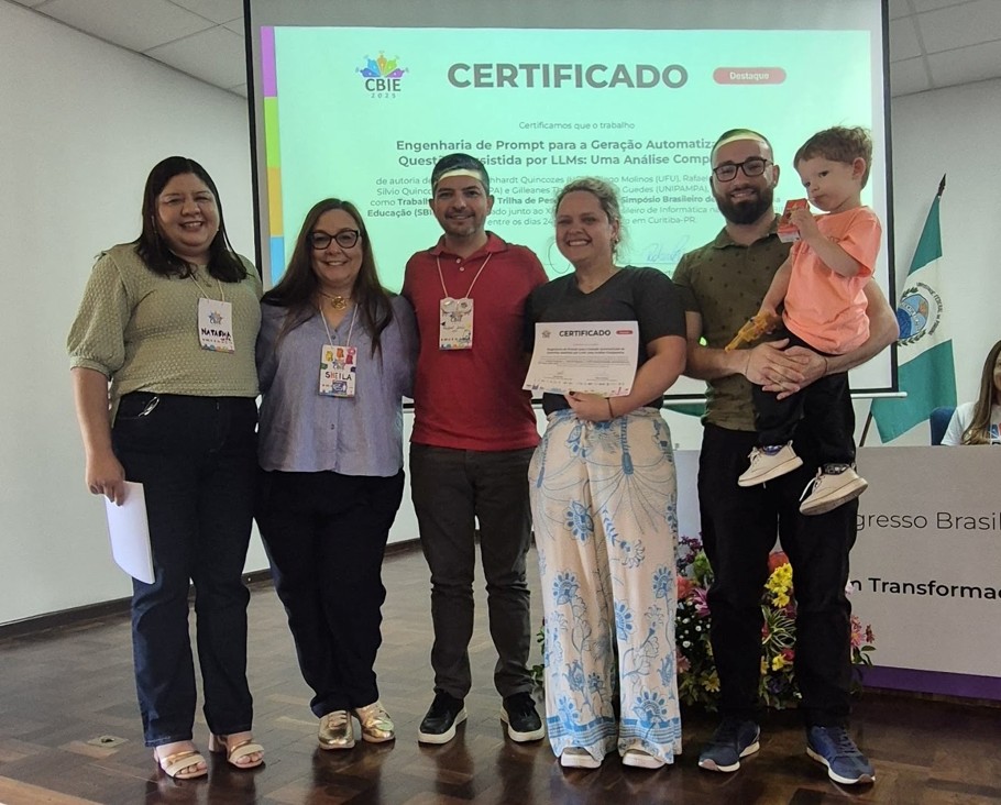 O trabalho intitulado “Engenharia de Prompt para a Geração Automatizada de Questões Assistida por LLMs: Uma Análise Comparativa”, de autoria da mestranda Camilla Borchhardt Quincozes (UFU), recebeu o prêmio de Trabalho Destaque na Trilha de Pesquisa do SBIE 2025. A pesquisa conta com orientação de Diego Molinos e Rafael D. Araújo (PPGCO/UFU), além dos professores parceiros: Silvio Quincozes e Gilleanes T. A. Guedes, conforme registro no certificado oficial emitido pela coordenação do evento.