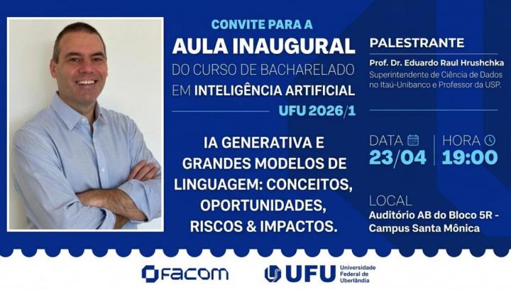 Convite para a aula inaugural do curso de bacharelado em Inteligência Artificial UFU 2026/1. Palestrante Prof. Dr. Eduardo Raul Hrushcka. Superintendente no Itaú-Unibanco e Professor da USP